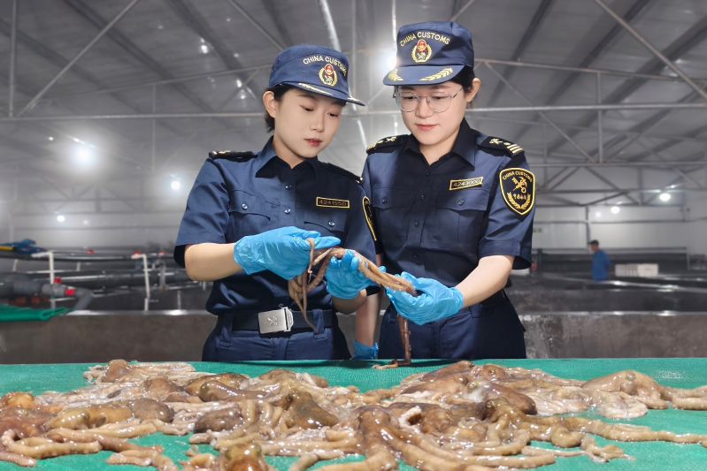 圖為:海關(guān)關(guān)員在車間現(xiàn)場查驗出口活章魚 張博寧/攝
