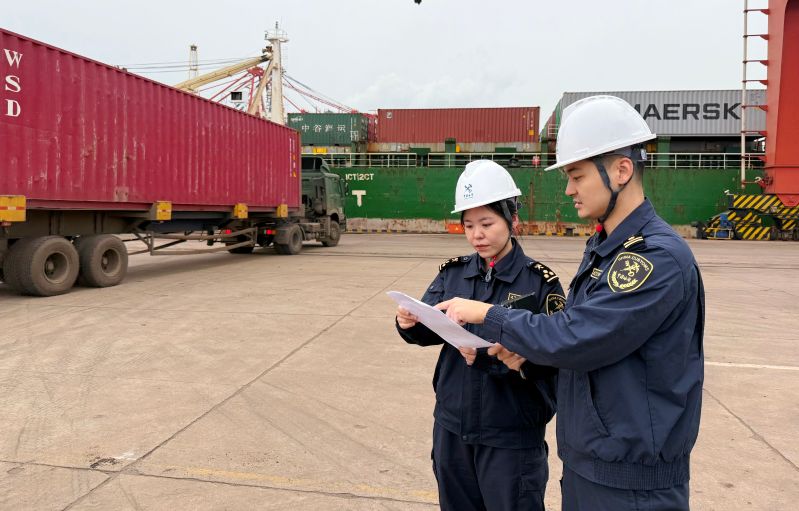 圖為:海關(guān)關(guān)員對內(nèi)支線貨物進行現(xiàn)場監(jiān)管 李想/攝
