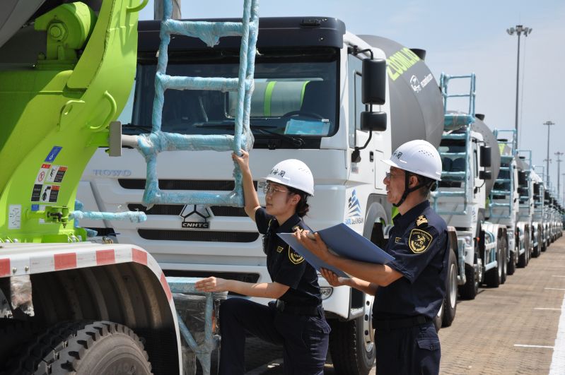 圖為:海關關員現(xiàn)場監(jiān)管查驗出口幾內(nèi)亞工程車輛 蔡子揚/攝