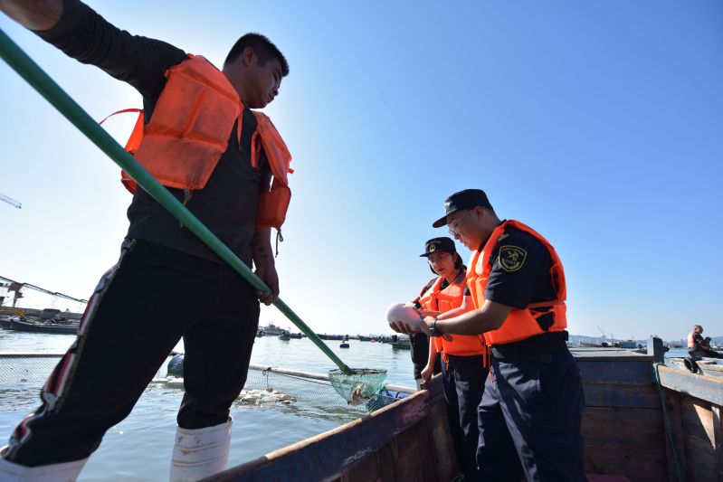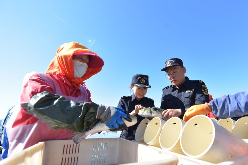 每年的9至11月份是河鲀出口旺季。9月23日,在山東煙臺(tái)芝罘島海邊,煙臺(tái)聚隆水產(chǎn)有限公司養(yǎng)殖的2300尾鮮活河鲀陸續(xù)被打撈、稱重、裝入筒中,青島海關(guān)所屬煙臺(tái)海關(guān)關(guān)員正在對(duì)出口河鲀實(shí)施現(xiàn)場(chǎng)監(jiān)管,經(jīng)檢驗(yàn)檢疫合格后,這批河鲀將被裝入活魚專用集裝箱,啟程發(fā)往韓國(guó)。
