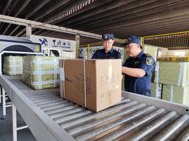 圖為:關(guān)員現(xiàn)場(chǎng)檢查跨境電商出口貨物(林海洋/攝)