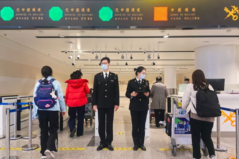圖為:海關(guān)關(guān)員正在監(jiān)管旅客通關(guān) 董巖/攝