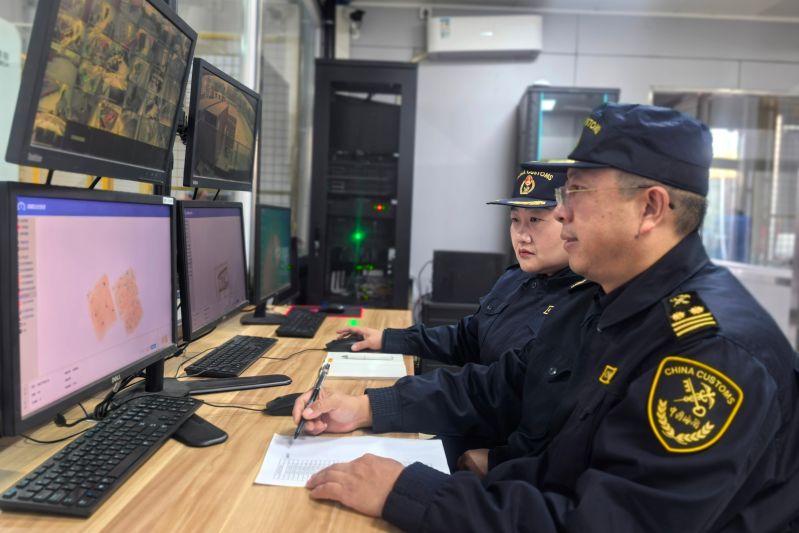 圖為:海關(guān)關(guān)員現(xiàn)場(chǎng)監(jiān)管跨境電商出口商品 孔祥旭/攝